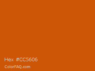 Hex #cc5606 Color is a normal orange color and the nearest color is Burnt Orange #cc5500. Hex code #cc5606 and RGB value is rgb(204,86,6). In RGB color space, this color is composed of 80% red, 34% green, 2% blue, In CMYK color space, this color is composed of 0% cyan, 58% magenta, 97% yellow , 20% black , In HSL color space, this color has a hue angle of 24° , 94% saturation and 41% lightness.