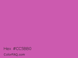 Hex #cc5bb0 Color is a normal magenta color and the nearest color is Super Pink #cf6ba9. Hex code #cc5bb0 and RGB value is rgb(204,91,176). In RGB color space, this color is composed of 80% red, 36% green, 69% blue, In CMYK color space, this color is composed of 0% cyan, 55% magenta, 14% yellow , 20% black , In HSL color space, this color has a hue angle of 315° , 53% saturation and 58% lightness.