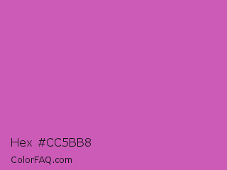 Hex #cc5bb8 Color is a normal magenta color and the nearest color is Fuchsia Pink #c154c1. Hex code #cc5bb8 and RGB value is rgb(204,91,184). In RGB color space, this color is composed of 80% red, 36% green, 72% blue, In CMYK color space, this color is composed of 0% cyan, 55% magenta, 10% yellow , 20% black , In HSL color space, this color has a hue angle of 311° , 53% saturation and 58% lightness.