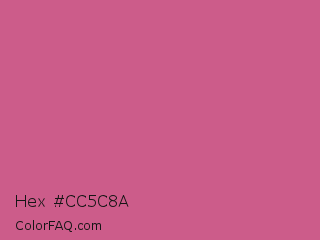 Hex #cc5c8a Color is a normal rose color and the nearest color is Cinnamon Satin #cd607e. Hex code #cc5c8a and RGB value is rgb(204,92,138). In RGB color space, this color is composed of 80% red, 36% green, 54% blue, In CMYK color space, this color is composed of 0% cyan, 55% magenta, 32% yellow , 20% black , In HSL color space, this color has a hue angle of 335° , 52% saturation and 58% lightness.