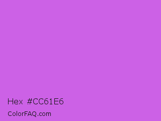 Hex #cc61e6 Color is a light purple color and the nearest color is Orchid #da70d6. Hex code #cc61e6 and RGB value is rgb(204,97,230). In RGB color space, this color is composed of 80% red, 38% green, 90% blue, In CMYK color space, this color is composed of 11% cyan, 58% magenta, 0% yellow , 10% black , In HSL color space, this color has a hue angle of 288° , 73% saturation and 64% lightness.