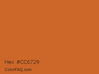 Hex #cc6729 Color is a normal orange color and the nearest color is Piper #c96323. Hex code #cc6729 and RGB value is rgb(204,103,41). In RGB color space, this color is composed of 80% red, 40% green, 16% blue, In CMYK color space, this color is composed of 0% cyan, 50% magenta, 80% yellow , 20% black , In HSL color space, this color has a hue angle of 23° , 67% saturation and 48% lightness.