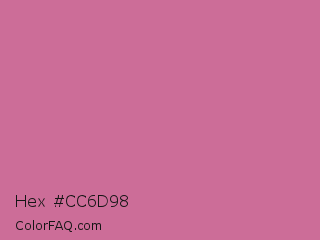 Hex #cc6d98 Color is a light rose color and the nearest color is Hopbush #d06da1. Hex code #cc6d98 and RGB value is rgb(204,109,152). In RGB color space, this color is composed of 80% red, 43% green, 60% blue, In CMYK color space, this color is composed of 0% cyan, 47% magenta, 25% yellow , 20% black , In HSL color space, this color has a hue angle of 333° , 48% saturation and 61% lightness.