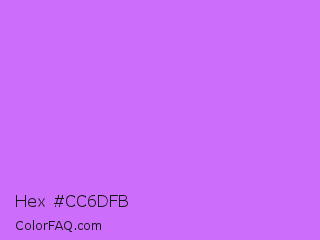 Hex #cc6dfb Color is a light purple color and the nearest color is Heliotrope #df73ff. Hex code #cc6dfb and RGB value is rgb(204,109,251). In RGB color space, this color is composed of 80% red, 43% green, 98% blue, In CMYK color space, this color is composed of 19% cyan, 57% magenta, 0% yellow , 2% black , In HSL color space, this color has a hue angle of 280° , 95% saturation and 71% lightness.