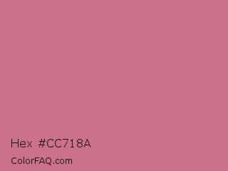 Hex #cc718a Color is a light rose color and the nearest color is Charm #d47494. Hex code #cc718a and RGB value is rgb(204,113,138). In RGB color space, this color is composed of 80% red, 44% green, 54% blue, In CMYK color space, this color is composed of 0% cyan, 45% magenta, 32% yellow , 20% black , In HSL color space, this color has a hue angle of 344° , 47% saturation and 62% lightness.