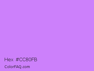 Hex #cc80fb Color is a light purple color and the nearest color is Heliotrope #df73ff. Hex code #cc80fb and RGB value is rgb(204,128,251). In RGB color space, this color is composed of 80% red, 50% green, 98% blue, In CMYK color space, this color is composed of 19% cyan, 49% magenta, 0% yellow , 2% black , In HSL color space, this color has a hue angle of 277° , 94% saturation and 74% lightness.