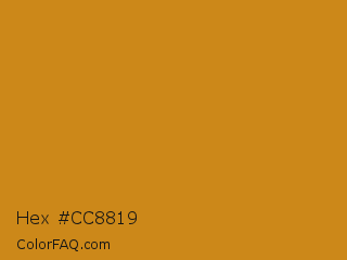 Hex #cc8819 Color is a normal orange color and the nearest color is Geebung #d18f1b. Hex code #cc8819 and RGB value is rgb(204,136,25). In RGB color space, this color is composed of 80% red, 53% green, 10% blue, In CMYK color space, this color is composed of 0% cyan, 33% magenta, 88% yellow , 20% black , In HSL color space, this color has a hue angle of 37° , 78% saturation and 45% lightness.