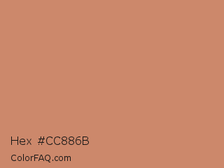 Hex #cc886b Color is a light orange color and the nearest color is Antique Brass #c88a65. Hex code #cc886b and RGB value is rgb(204,136,107). In RGB color space, this color is composed of 80% red, 53% green, 42% blue, In CMYK color space, this color is composed of 0% cyan, 33% magenta, 48% yellow , 20% black , In HSL color space, this color has a hue angle of 18° , 49% saturation and 61% lightness.