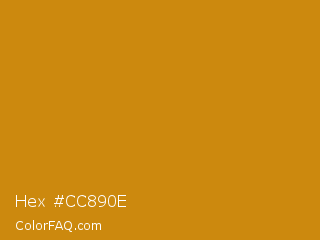 Hex #cc890e Color is a normal orange color and the nearest color is Meteor #d07d12. Hex code #cc890e and RGB value is rgb(204,137,14). In RGB color space, this color is composed of 80% red, 54% green, 5% blue, In CMYK color space, this color is composed of 0% cyan, 33% magenta, 93% yellow , 20% black , In HSL color space, this color has a hue angle of 39° , 87% saturation and 43% lightness.