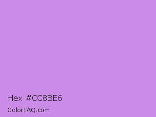Hex #cc8be6 Color is a light purple color and the nearest color is Bright Lavender #bf94e4. Hex code #cc8be6 and RGB value is rgb(204,139,230). In RGB color space, this color is composed of 80% red, 55% green, 90% blue, In CMYK color space, this color is composed of 11% cyan, 40% magenta, 0% yellow , 10% black , In HSL color space, this color has a hue angle of 283° , 65% saturation and 72% lightness.