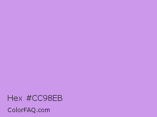 Hex #cc98eb Color is a light purple color and the nearest color is Bright Ube #d19fe8. Hex code #cc98eb and RGB value is rgb(204,152,235). In RGB color space, this color is composed of 80% red, 60% green, 92% blue, In CMYK color space, this color is composed of 13% cyan, 35% magenta, 0% yellow , 8% black , In HSL color space, this color has a hue angle of 278° , 67% saturation and 76% lightness.