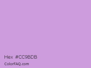 Hex #cc9bdb Color is a light purple color and the nearest color is Light Wisteria #c9a0dc. Hex code #cc9bdb and RGB value is rgb(204,155,219). In RGB color space, this color is composed of 80% red, 61% green, 86% blue, In CMYK color space, this color is composed of 7% cyan, 29% magenta, 0% yellow , 14% black , In HSL color space, this color has a hue angle of 286° , 47% saturation and 73% lightness.