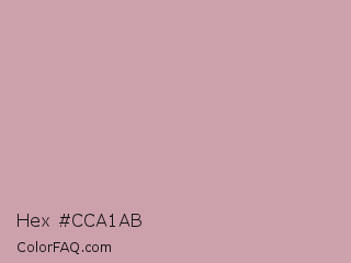 Hex #cca1ab Color is a light red color and the nearest color is Careys Pink #d29eaa. Hex code #cca1ab and RGB value is rgb(204,161,171). In RGB color space, this color is composed of 80% red, 63% green, 67% blue, In CMYK color space, this color is composed of 0% cyan, 21% magenta, 16% yellow , 20% black , In HSL color space, this color has a hue angle of 346° , 30% saturation and 72% lightness.