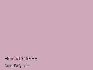 Hex #cca8b8 Color is a light rose color and the nearest color is Lily #c8aabf. Hex code #cca8b8 and RGB value is rgb(204,168,184). In RGB color space, this color is composed of 80% red, 66% green, 72% blue, In CMYK color space, this color is composed of 0% cyan, 18% magenta, 10% yellow , 20% black , In HSL color space, this color has a hue angle of 333° , 26% saturation and 73% lightness.
