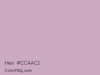 Hex #ccaac1 Color is a light magenta color and the nearest color is Lily #c8aabf. Hex code #ccaac1 and RGB value is rgb(204,170,193). In RGB color space, this color is composed of 80% red, 67% green, 76% blue, In CMYK color space, this color is composed of 0% cyan, 17% magenta, 5% yellow , 20% black , In HSL color space, this color has a hue angle of 319° , 25% saturation and 73% lightness.