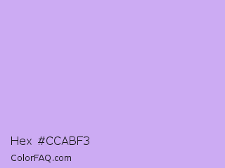 Hex #ccabf3 Color is a very light violet color and the nearest color is Bright Ube #d19fe8. Hex code #ccabf3 and RGB value is rgb(204,171,243). In RGB color space, this color is composed of 80% red, 67% green, 95% blue, In CMYK color space, this color is composed of 16% cyan, 30% magenta, 0% yellow , 5% black , In HSL color space, this color has a hue angle of 268° , 75% saturation and 81% lightness.