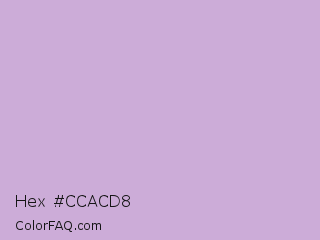 Hex #ccacd8 Color is a light purple color and the nearest color is Tropical Violet #cda4de. Hex code #ccacd8 and RGB value is rgb(204,172,216). In RGB color space, this color is composed of 80% red, 67% green, 85% blue, In CMYK color space, this color is composed of 6% cyan, 20% magenta, 0% yellow , 15% black , In HSL color space, this color has a hue angle of 284° , 36% saturation and 76% lightness.