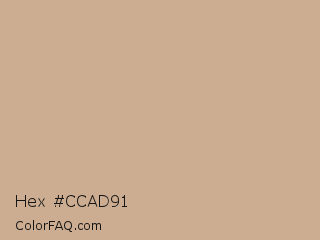 Hex #ccad91 Color is a light orange color and the nearest color is Indian Khaki #c3b091. Hex code #ccad91 and RGB value is rgb(204,173,145). In RGB color space, this color is composed of 80% red, 68% green, 57% blue, In CMYK color space, this color is composed of 0% cyan, 15% magenta, 29% yellow , 20% black , In HSL color space, this color has a hue angle of 28° , 37% saturation and 68% lightness.