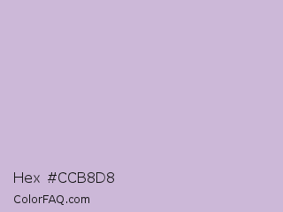Hex #ccb8d8 Color is a light purple color and the nearest color is Thistle #d8bfd8. Hex code #ccb8d8 and RGB value is rgb(204,184,216). In RGB color space, this color is composed of 80% red, 72% green, 85% blue, In CMYK color space, this color is composed of 6% cyan, 15% magenta, 0% yellow , 15% black , In HSL color space, this color has a hue angle of 278° , 29% saturation and 78% lightness.