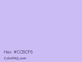 Hex #ccbcf6 Color is a very light indigo color and the nearest color is Perfume #d0bef8. Hex code #ccbcf6 and RGB value is rgb(204,188,246). In RGB color space, this color is composed of 80% red, 74% green, 96% blue, In CMYK color space, this color is composed of 17% cyan, 24% magenta, 0% yellow , 4% black , In HSL color space, this color has a hue angle of 257° , 76% saturation and 85% lightness.