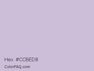 Hex #ccbed8 Color is a light purple color and the nearest color is Thistle #d8bfd8. Hex code #ccbed8 and RGB value is rgb(204,190,216). In RGB color space, this color is composed of 80% red, 75% green, 85% blue, In CMYK color space, this color is composed of 6% cyan, 12% magenta, 0% yellow , 15% black , In HSL color space, this color has a hue angle of 272° , 25% saturation and 80% lightness.