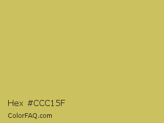 Hex #ccc15f Color is a normal yellow color and the nearest color is Tacha #d6c562. Hex code #ccc15f and RGB value is rgb(204,193,95). In RGB color space, this color is composed of 80% red, 76% green, 37% blue, In CMYK color space, this color is composed of 0% cyan, 5% magenta, 53% yellow , 20% black , In HSL color space, this color has a hue angle of 54° , 52% saturation and 59% lightness.