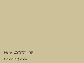 Hex #ccc198 Color is a light yellow color and the nearest color is Yuma #cec291. Hex code #ccc198 and RGB value is rgb(204,193,152). In RGB color space, this color is composed of 80% red, 76% green, 60% blue, In CMYK color space, this color is composed of 0% cyan, 5% magenta, 25% yellow , 20% black , In HSL color space, this color has a hue angle of 47° , 34% saturation and 70% lightness.