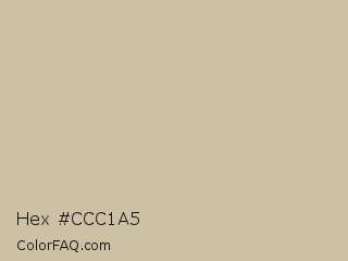 Hex #ccc1a5 Color is a light orange color and the nearest color is Vanilla #d1bea8. Hex code #ccc1a5 and RGB value is rgb(204,193,165). In RGB color space, this color is composed of 80% red, 76% green, 65% blue, In CMYK color space, this color is composed of 0% cyan, 5% magenta, 19% yellow , 20% black , In HSL color space, this color has a hue angle of 43° , 28% saturation and 72% lightness.