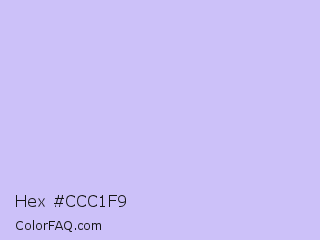 Hex #ccc1f9 Color is a very light indigo color and the nearest color is Perfume #d0bef8. Hex code #ccc1f9 and RGB value is rgb(204,193,249). In RGB color space, this color is composed of 80% red, 76% green, 98% blue, In CMYK color space, this color is composed of 18% cyan, 22% magenta, 0% yellow , 2% black , In HSL color space, this color has a hue angle of 252° , 82% saturation and 87% lightness.