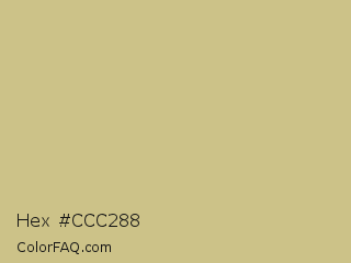 Hex #ccc288 Color is a light yellow color and the nearest color is Yuma #cec291. Hex code #ccc288 and RGB value is rgb(204,194,136). In RGB color space, this color is composed of 80% red, 76% green, 53% blue, In CMYK color space, this color is composed of 0% cyan, 5% magenta, 33% yellow , 20% black , In HSL color space, this color has a hue angle of 51° , 40% saturation and 67% lightness.