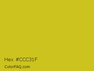Hex #ccc31f Color is a normal yellow color and the nearest color is Key Lime Pie #bfc921. Hex code #ccc31f and RGB value is rgb(204,195,31). In RGB color space, this color is composed of 80% red, 76% green, 12% blue, In CMYK color space, this color is composed of 0% cyan, 4% magenta, 85% yellow , 20% black , In HSL color space, this color has a hue angle of 57° , 74% saturation and 46% lightness.