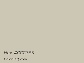 Hex #ccc7b5 Color is a light yellow color and the nearest color is Foggy Gray #cbcab6. Hex code #ccc7b5 and RGB value is rgb(204,199,181). In RGB color space, this color is composed of 80% red, 78% green, 71% blue, In CMYK color space, this color is composed of 0% cyan, 2% magenta, 11% yellow , 20% black , In HSL color space, this color has a hue angle of 47° , 18% saturation and 75% lightness.