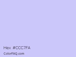Hex #ccc7fa Color is a very light indigo color and the nearest color is Periwinkle #ccccff. Hex code #ccc7fa and RGB value is rgb(204,199,250). In RGB color space, this color is composed of 80% red, 78% green, 98% blue, In CMYK color space, this color is composed of 18% cyan, 20% magenta, 0% yellow , 2% black , In HSL color space, this color has a hue angle of 246° , 84% saturation and 88% lightness.