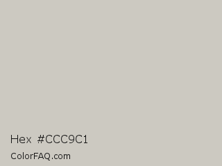 Hex #ccc9c1 Color is a light orange color and the nearest color is Kangaroo #c6c8bd. Hex code #ccc9c1 and RGB value is rgb(204,201,193). In RGB color space, this color is composed of 80% red, 79% green, 76% blue, In CMYK color space, this color is composed of 0% cyan, 1% magenta, 5% yellow , 20% black , In HSL color space, this color has a hue angle of 44° , 10% saturation and 78% lightness.