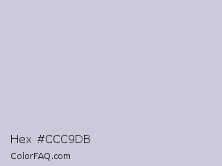 Hex #ccc9db Color is a very light indigo color and the nearest color is Ghost #c7c9d5. Hex code #ccc9db and RGB value is rgb(204,201,219). In RGB color space, this color is composed of 80% red, 79% green, 86% blue, In CMYK color space, this color is composed of 7% cyan, 8% magenta, 0% yellow , 14% black , In HSL color space, this color has a hue angle of 250° , 20% saturation and 82% lightness.