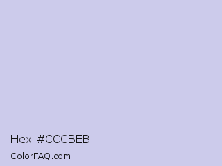 Hex #cccbeb Color is a very light indigo color and the nearest color is Soap #cec8ef. Hex code #cccbeb and RGB value is rgb(204,203,235). In RGB color space, this color is composed of 80% red, 80% green, 92% blue, In CMYK color space, this color is composed of 13% cyan, 14% magenta, 0% yellow , 8% black , In HSL color space, this color has a hue angle of 242° , 44% saturation and 86% lightness.