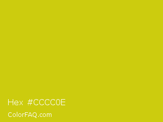 Hex #cccc0e Color is a normal yellow color and the nearest color is Bird Flower #d4cd16. Hex code #cccc0e and RGB value is rgb(204,204,14). In RGB color space, this color is composed of 80% red, 80% green, 5% blue, In CMYK color space, this color is composed of 0% cyan, 0% magenta, 93% yellow , 20% black , In HSL color space, this color has a hue angle of 60° , 87% saturation and 43% lightness.
