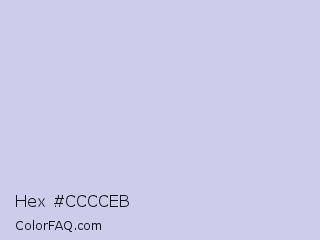 Hex #cccceb Color is a very light blue color and the nearest color is Soap #cec8ef. Hex code #cccceb and RGB value is rgb(204,204,235). In RGB color space, this color is composed of 80% red, 80% green, 92% blue, In CMYK color space, this color is composed of 13% cyan, 13% magenta, 0% yellow , 8% black , In HSL color space, this color has a hue angle of 240° , 44% saturation and 86% lightness.