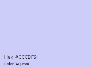 Hex #cccdf9 Color is a very light blue color and the nearest color is Periwinkle #ccccff. Hex code #cccdf9 and RGB value is rgb(204,205,249). In RGB color space, this color is composed of 80% red, 80% green, 98% blue, In CMYK color space, this color is composed of 18% cyan, 18% magenta, 0% yellow , 2% black , In HSL color space, this color has a hue angle of 239° , 79% saturation and 89% lightness.