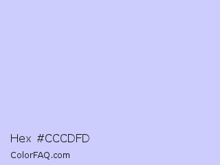 Hex #cccdfd Color is a very light blue color and the nearest color is Periwinkle #ccccff. Hex code #cccdfd and RGB value is rgb(204,205,253). In RGB color space, this color is composed of 80% red, 80% green, 99% blue, In CMYK color space, this color is composed of 19% cyan, 19% magenta, 0% yellow , 1% black , In HSL color space, this color has a hue angle of 239° , 92% saturation and 90% lightness.
