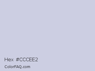 Hex #cccee2 Color is a very light blue color and the nearest color is Mischka #d1d2dd. Hex code #cccee2 and RGB value is rgb(204,206,226). In RGB color space, this color is composed of 80% red, 81% green, 89% blue, In CMYK color space, this color is composed of 10% cyan, 9% magenta, 0% yellow , 11% black , In HSL color space, this color has a hue angle of 235° , 28% saturation and 84% lightness.