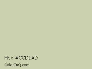 Hex #ccd1ad Color is a light yellow color and the nearest color is Green Mist #cbd3b0. Hex code #ccd1ad and RGB value is rgb(204,209,173). In RGB color space, this color is composed of 80% red, 82% green, 68% blue, In CMYK color space, this color is composed of 2% cyan, 0% magenta, 17% yellow , 18% black , In HSL color space, this color has a hue angle of 68° , 28% saturation and 75% lightness.