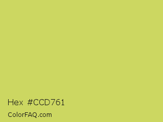Hex #ccd761 Color is a light yellow color and the nearest color is June Bud #bdda57. Hex code #ccd761 and RGB value is rgb(204,215,97). In RGB color space, this color is composed of 80% red, 84% green, 38% blue, In CMYK color space, this color is composed of 5% cyan, 0% magenta, 55% yellow , 16% black , In HSL color space, this color has a hue angle of 66° , 60% saturation and 61% lightness.