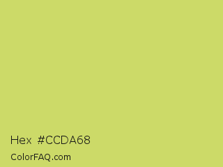 Hex #ccda68 Color is a light yellow color and the nearest color is Booger Buster #dde26a. Hex code #ccda68 and RGB value is rgb(204,218,104). In RGB color space, this color is composed of 80% red, 85% green, 41% blue, In CMYK color space, this color is composed of 6% cyan, 0% magenta, 52% yellow , 15% black , In HSL color space, this color has a hue angle of 67° , 61% saturation and 63% lightness.