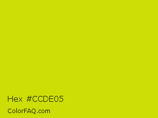 Hex #ccde05 Color is a normal yellow color and the nearest color is Bitter Lemon #cae00d. Hex code #ccde05 and RGB value is rgb(204,222,5). In RGB color space, this color is composed of 80% red, 87% green, 2% blue, In CMYK color space, this color is composed of 8% cyan, 0% magenta, 98% yellow , 13% black , In HSL color space, this color has a hue angle of 65° , 96% saturation and 45% lightness.
