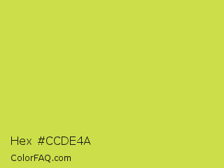 Hex #ccde4a Color is a normal yellow color and the nearest color is Maximum Green Yellow #d9e650. Hex code #ccde4a and RGB value is rgb(204,222,74). In RGB color space, this color is composed of 80% red, 87% green, 29% blue, In CMYK color space, this color is composed of 8% cyan, 0% magenta, 67% yellow , 13% black , In HSL color space, this color has a hue angle of 67° , 69% saturation and 58% lightness.
