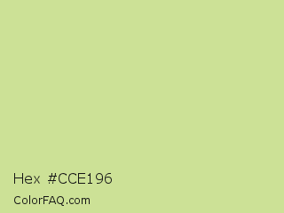 Hex #cce196 Color is a light lime color and the nearest color is Deco #d2da97. Hex code #cce196 and RGB value is rgb(204,225,150). In RGB color space, this color is composed of 80% red, 88% green, 59% blue, In CMYK color space, this color is composed of 9% cyan, 0% magenta, 33% yellow , 12% black , In HSL color space, this color has a hue angle of 77° , 56% saturation and 74% lightness.