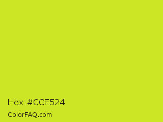 Hex #cce524 Color is a normal yellow color and the nearest color is Pear #d1e231. Hex code #cce524 and RGB value is rgb(204,229,36). In RGB color space, this color is composed of 80% red, 90% green, 14% blue, In CMYK color space, this color is composed of 11% cyan, 0% magenta, 84% yellow , 10% black , In HSL color space, this color has a hue angle of 68° , 79% saturation and 52% lightness.