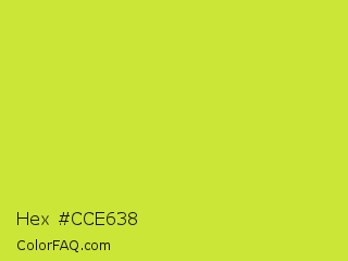 Hex #cce638 Color is a normal yellow color and the nearest color is Pear #d1e231. Hex code #cce638 and RGB value is rgb(204,230,56). In RGB color space, this color is composed of 80% red, 90% green, 22% blue, In CMYK color space, this color is composed of 11% cyan, 0% magenta, 76% yellow , 10% black , In HSL color space, this color has a hue angle of 69° , 78% saturation and 56% lightness.