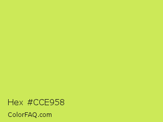 Hex #cce958 Color is a light lime color and the nearest color is Maximum Green Yellow #d9e650. Hex code #cce958 and RGB value is rgb(204,233,88). In RGB color space, this color is composed of 80% red, 91% green, 35% blue, In CMYK color space, this color is composed of 12% cyan, 0% magenta, 62% yellow , 9% black , In HSL color space, this color has a hue angle of 72° , 77% saturation and 63% lightness.
